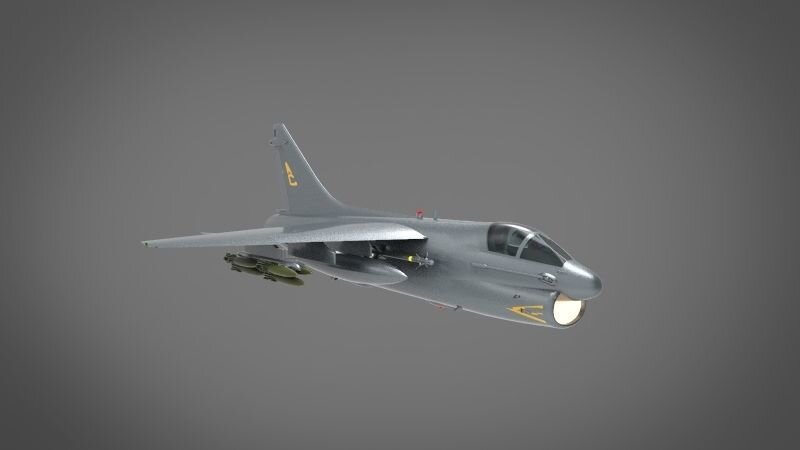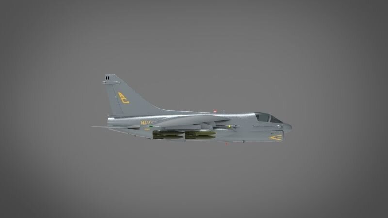 The A-7E Corsair II is a carrier-capable attack aircraft developed by Ling-Temco-Vought (LTV) for the United States Navy. Introduced in the late 1960s, the A-7E is a single-seat, subsonic jet renowned for its ruggedness and versatility. It features advanced avionics for its time, including a digital navigation and weapons delivery system, which enhanced its accuracy in both day and night operations. The A-7E's design includes a high-mounted wing, a spacious cockpit, and a powerful Allison TF41-A-2 turbofan engine, providing a balance of speed, range, and payload capacity. The Corsair II played a significant role in various military engagements, including the Vietnam War and Operation Desert Storm, showcasing its reliability and effectiveness in close air support and strike missions.