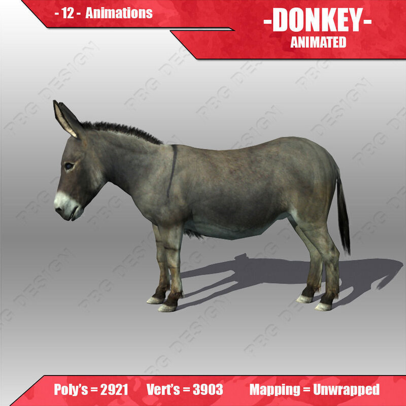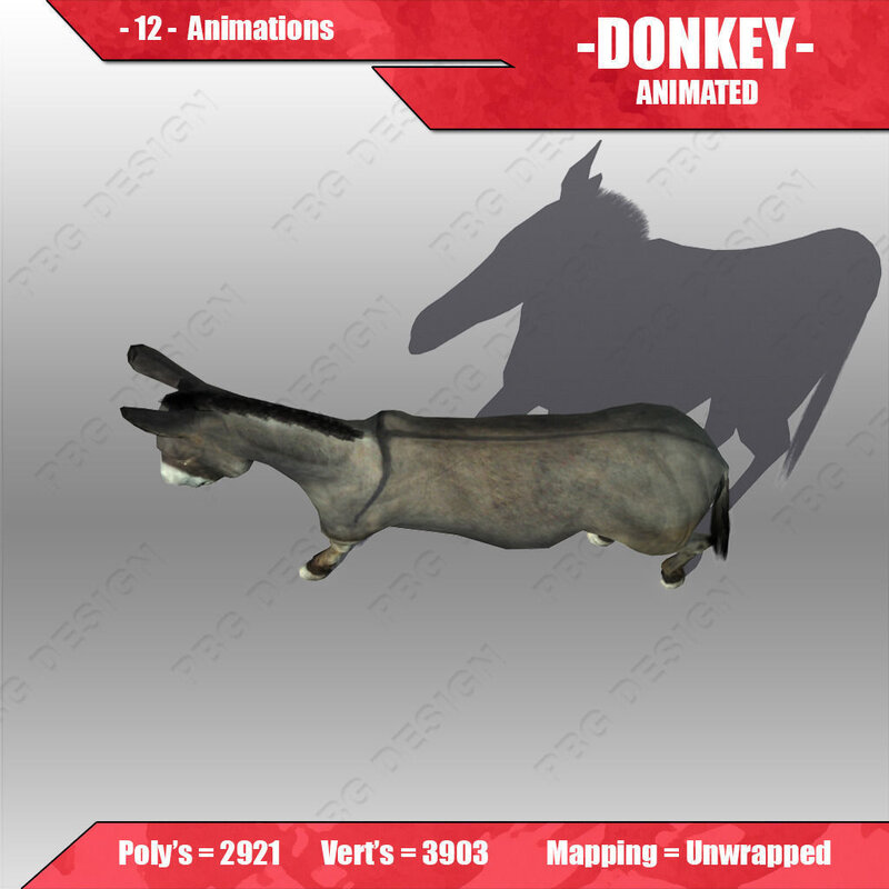 Donkey A low poly model of a Donkey fully rigged and textures. Has facial bones to control lips, braw and eyelids. Great for games and animations.