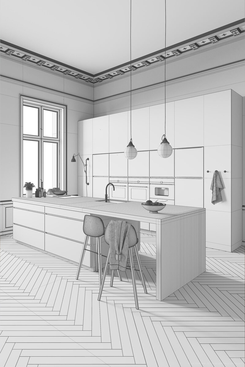 All my Cinema 4D and Corona scenes are hand made polygon by polygon and include light setup, materials, textures, camera settings, final PSD with adjustment layers (if needed), furniture and props with a high level of detail. You can use them to improve your visualizations or learn from the files, moving inside the project, observing how light was created and handled, how materials are developed, and the values that fill every single option.