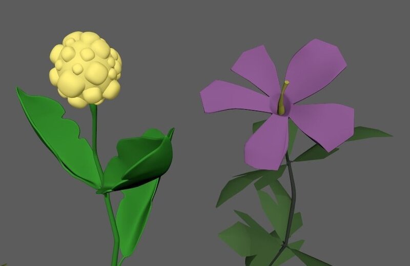 4 flowers to populate a scene. They are fictitious flowers, purple, white or yellow. You can change the colors, there are trumpets, balls and a standard. All ellements are grouped, quadrangulated, clean.