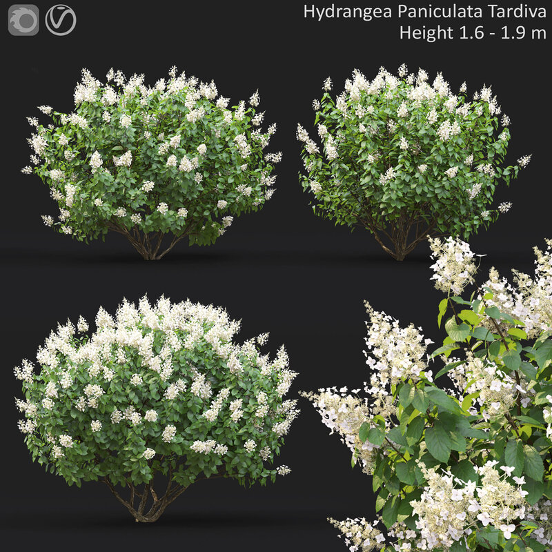 In the scene there are 3 shrubs of hydrangea paniculata during the flowering period.