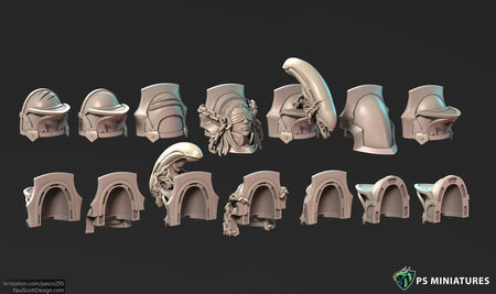 5 Shoulder pieces are designed to be used as mounts for skulls and heads from other packs. 2 Shoulder pieces have a faction icon and alien head preattached.
